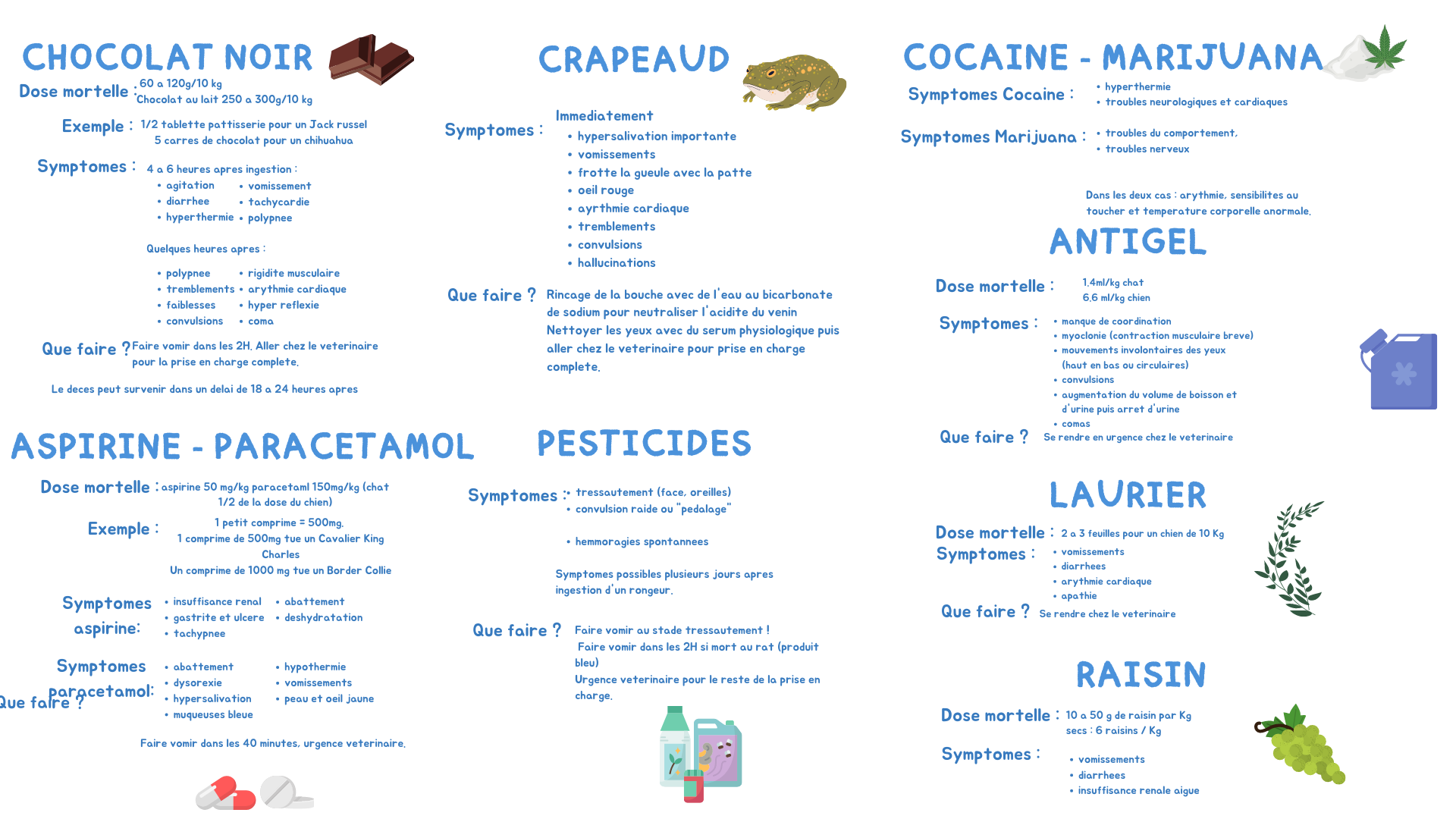 • médicaments : antidépresseurs, antalgiques, médicaments contre l'hypertension artérielle et thyroïde. NE JAMAIS donner de doliprane ou de paracétamol à un animal !